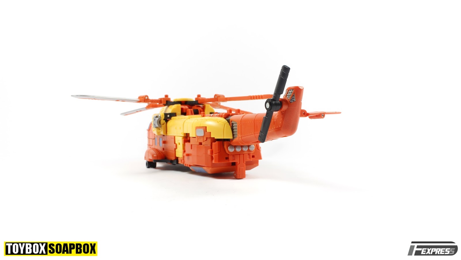 Sworder converts from dubious rolling thing into a much more palatable looking helicopter that nicely echoes Sandstorms original Generation 1 chopper mode, complete with the floats on either side. What we have is some form of rescue helicopter and as ridiculous as those colours look on it they aren’t too outlandish for a coast guard vehicle.