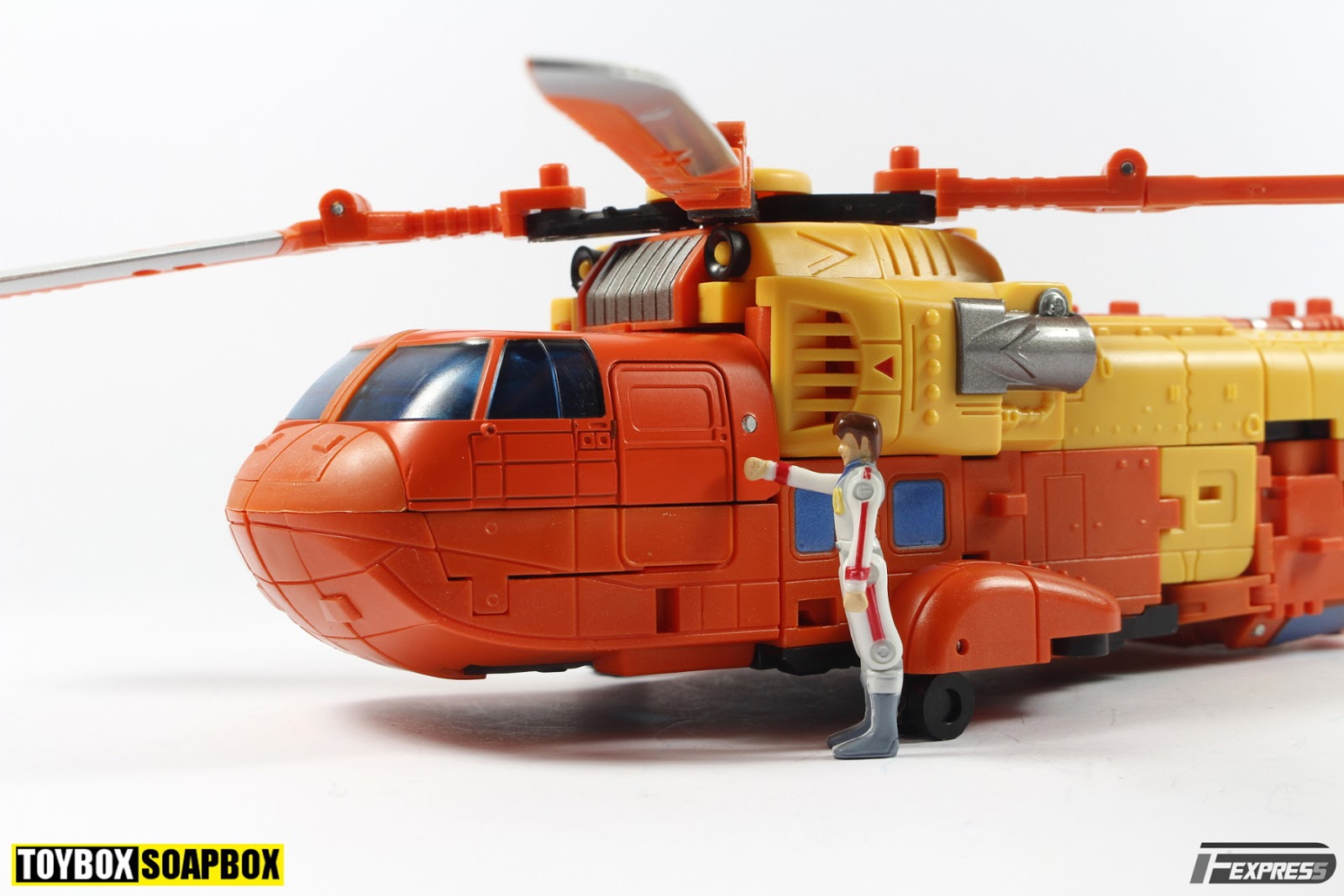 Sworder converts from dubious rolling thing into a much more palatable looking helicopter that nicely echoes Sandstorms original Generation 1 chopper mode, complete with the floats on either side. What we have is some form of rescue helicopter and as ridiculous as those colours look on it they aren’t too outlandish for a coast guard vehicle.