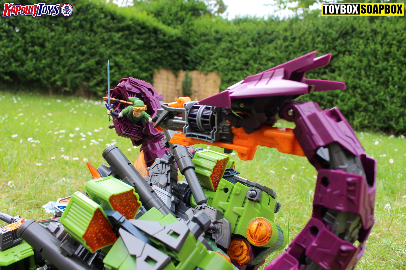 Detail cut’s across every surface of the figure, but never offensively. Colour is used brilliantly too. Most of it is decked in purple and green with grey adding a “robotic” quality to stop it looking too Lovecraftian and the gorgeous clear orange plastic on the flipped up robot knee guards look like they are humming with energy or acting as massive eye obliterating spotlights. The way the clear orange plastic is dotted around gives it a living quality that is hard to pin down.