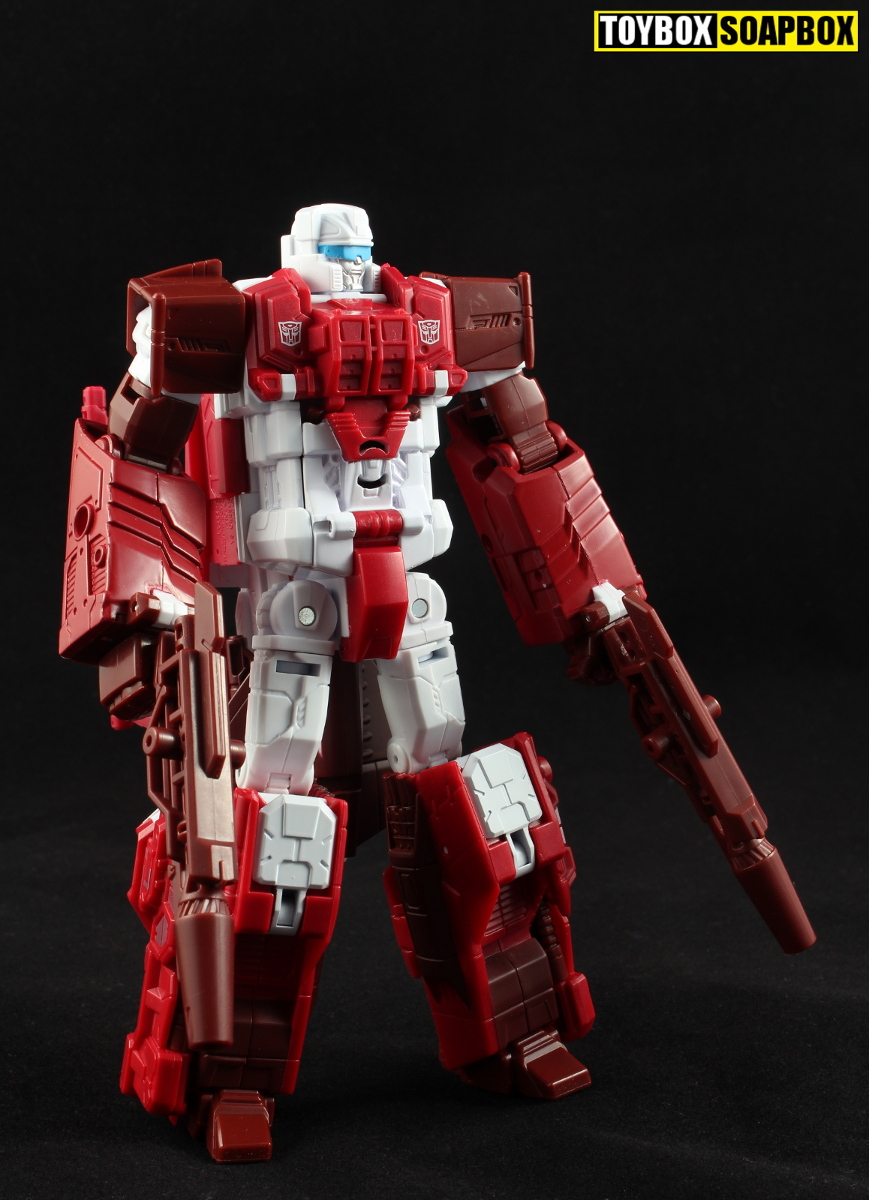 G1 fiction provided Nosecone with the persona of a slow, pondering bot who was really a perfectionist (thanks again TFwiki!) which was in stark contrast to the other Technobots. Rook’s body may give Nosecone a certain bulky profile but the new head sculpt depicts the personality perfectly. It’s contemporary in shape and design but that expression just nicely captures Nosecone in thought. A lot of paint and colour is used for a deluxe. Exquisite sounds like a nice, apt posh word for it