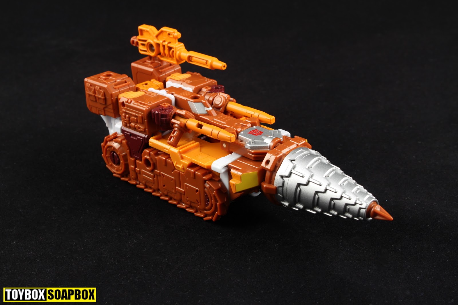 Wheels are out treads are in as Rook turns orange, white and brown for his new life cosplaying as Nosecone. Most of the Combiner Wars moulds are designed to be someone else at one time or another so Hasbro and Takara developed a system that makes swapping out a few parts to get a different character incredibly cheap and easy. Nowhere is this more apparent than on Rook whose wheels and roof are simply replaced with tank treads and a cabin without the need for any remoulding to the core figure. These are just swappable parts.