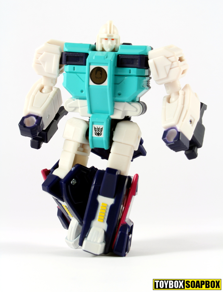 Gorgeous teal, dark blue and white pops right out of the 80’s even more strongly on the robot form. Strain your eyes you will spot that the torso details are almost identical on both Autobot and Decepticon clones with only one significant change. The central section is no longer a flip up seat and is in fact a piece exclusive to the Cons. Hasbro painted the rounded sections around waist white which distinguishes the two sets of clones from one another and has the bonus effect of making Wingspan look like he’s modelled his fashion sense from Simon Cowell’s pulled up trousers, whilst adding a Word Up style codpiece.