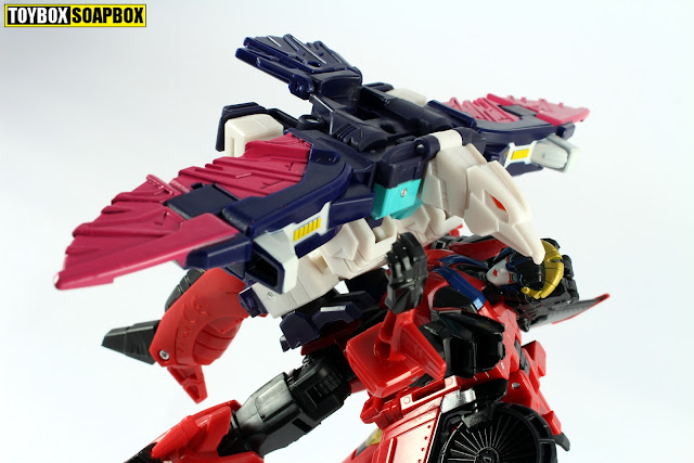 Lovely detailed wings evoke metal feathers and are brushed with the sort of hot pink that Misfire has trademarked. Each wing has transformation hinges that also give you some options for posing. Wingspan’s bird feet also have the tiniest amount of movement with one tiny click backwards. It’s kinda charmingly pathetic?